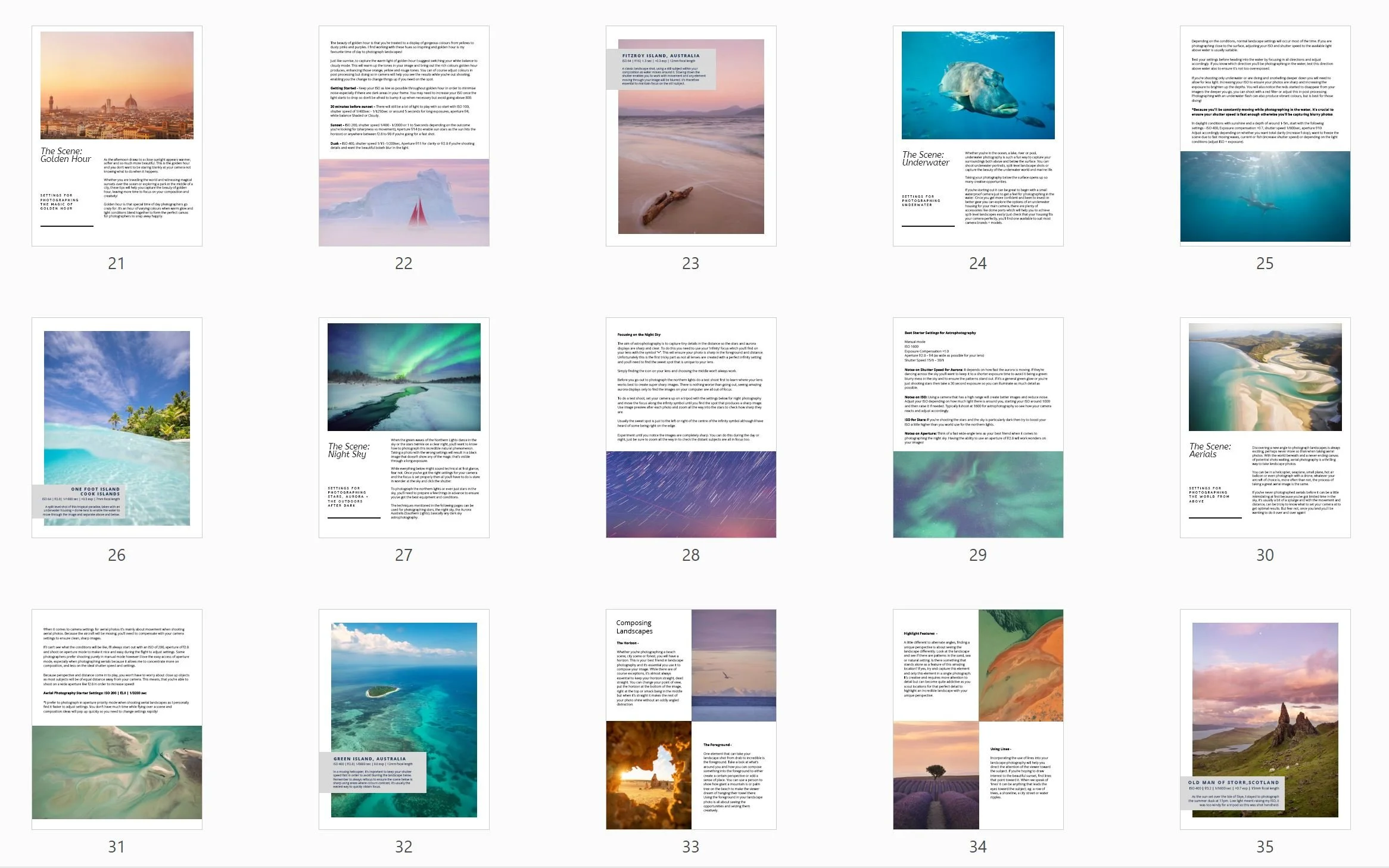 *Please note, this eBook is not camera brand specific and focuses more on the overall settings required for each scene, you can apply all settings mentioned to whatever camera you opt to use!